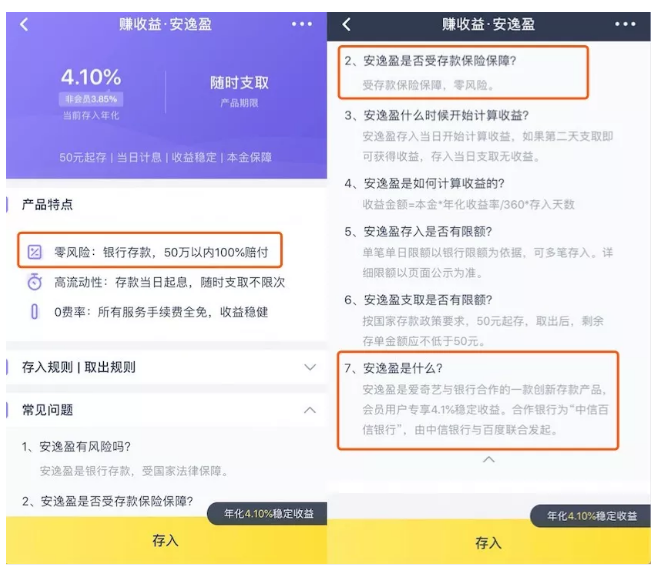 “零钱Plus”是爱奇艺和百信银行在2018年6月推出的一项金融服务功能,用户在“零钱Plus”里存钱后,可以购买一款叫“安逸盈”的金融产品,爱奇艺会员可以享受4.1%年化收益,非爱奇艺会员享受3.85%的年化收益,随存随取,当日计息。