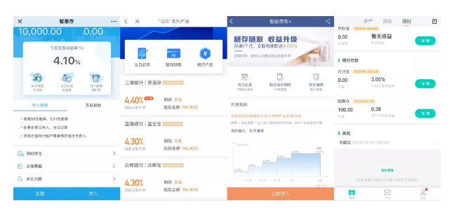 截图页面分别是百信银行、京东金融、微众银行、网商银行智能存款同类产品界面