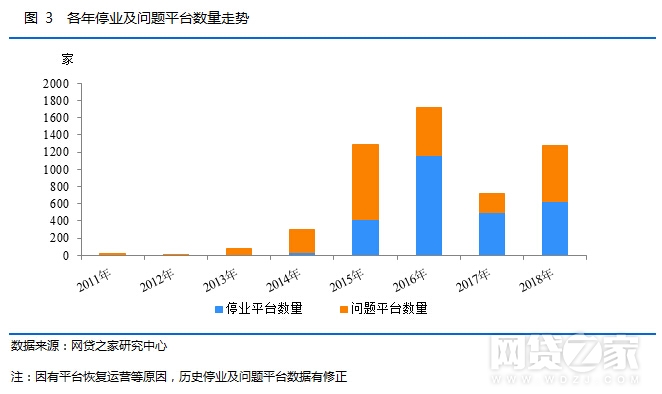 2018年P2P网贷行业经历了备案延期到平台加速出清的过程,全年退出行业的平台数量为1279家,相比2017年增加了556家。从退出的数量看,仍少于2015年的1291家和2016年1721家。不过2018年问题平台的影响却是最广的,据不完全统计,2018年问题平台涉及金额超过千亿元。从停业及问题平台的业务类型看,2018年问题平台数量占比达到51.45%,相比2017年的30.84%有所上升。