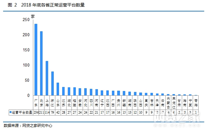 截至2018年底,正常运营平台数量排名前三位的是广东、北京、上海,数量分别为236家、211家、114家,浙江紧随其后,正常运营平台数量为79家,四地占全国总平台数量的62.68%,可见我国的P2P网贷行业地域集中度仍然较高,不过相比2017年集中度略有下降,也与这四个地区平台数量下降较大有关。