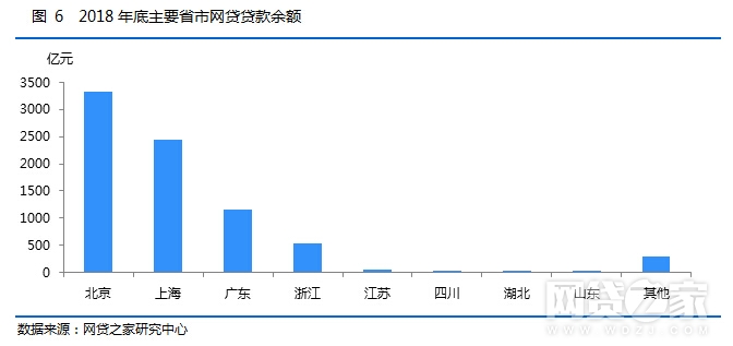 从各省市分布上看,北京、上海、广东三个地区的贷款余额排名全国前三位,2018年底的贷款余额分别为3321.19亿元、2445.43亿元、1163.63亿元,三个地区占全国贷款余额的比例为87.84%。浙江、江苏紧随其后,2018年底的贷款余额分别为532.14亿元、56.16亿元。