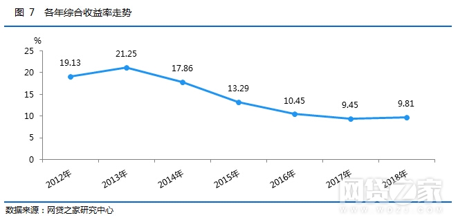2018年网贷行业总体综合收益率为9.81%,相比2017年网贷行业总体综合收益率上升了36个基点(1个基点=0.01%)。2018年综合收益率小幅回升,主要是因为今年行业负面舆情较多,投资人投资信心下降,不少平台为吸引新的投资人和提高老用户留存率,进行了加息活动。风险的集中爆发导致出借人风险偏好整体下降,再加上资产端借款利率基本趋于稳定,预计2019年网贷行业综合收益率也将维持9%-10%之间水平。
