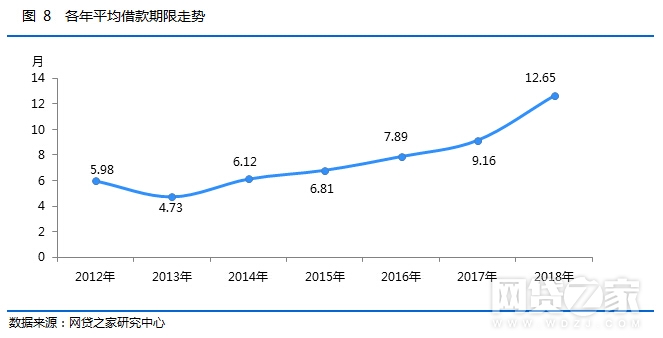 2018年网贷行业平均借款期限为12.65个月,相比2017年拉长了3.49个月。如下图所示,从2014年开始网贷行业的借款期限一直呈现拉长的趋势,这主要是因为随着行业发展趋于成熟,打着“期限短、高利率”旗号的小平台逐渐清退,当前正常运营平台尤其大体量平台,更倾向于发布长期项目标的,从而带动行业平均借款期限拉长。随着备案有序平稳的进行,行业再经过一轮洗牌,预计2019年全年网贷行业平均借款期限将继续走高,或能超过15个月。