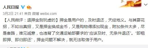 【人民微评:退押金别玩虚的】押金是用户的,及时退还,天经地义。与其耍花招,不如出真招,又是押金换成金币,又是购物得添加现金,附加条件太多,尽是套路,难见诚意,也违背了交通运输部要求的“应该及时、无条件退还”。“即租即押、即归即还”,押金问题不解决,就无法取信于用户。