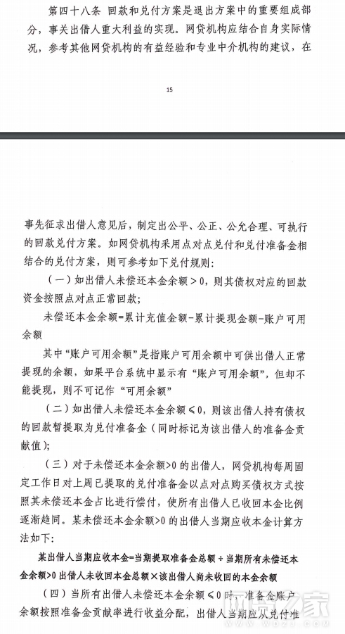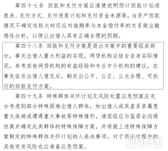另外据网贷之家观察,此次指引与之前的征求意见稿整体上无太大差别,但指引正式版中增加了第十一条“清退组可视情况成立相关内设责任机构,其中组长为必备职位,组长原则上应由网贷机构的实际控制人或主要高管担任。”另外征求意见稿中第三十九条“合法性原则是指有关方案如违反与出借人的原有合同约定,则应在获得出借人投票表决授权后合理合法修改”、第五十五条“为提高清收效果,清退组可采取网贷机构或其股东受让出借人债权后统一对逾期借款人进行诉讼等灵活形式,以提升清收效果”,这在正式版指引中予以删除;征求意见稿中“”第四十八条内容在正式版指引中改动较大,具体如下图所示: