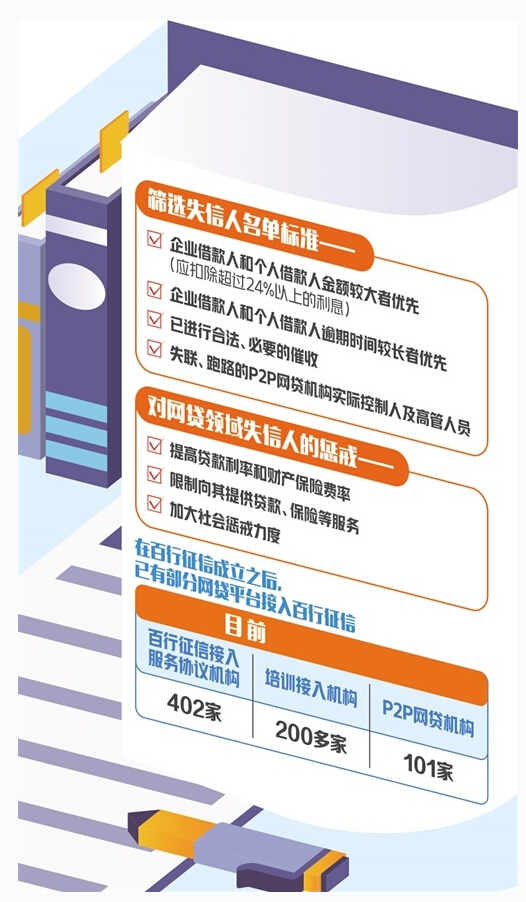 近年来,部分借款人恶意逃废债、逾期不还款,加剧了P2P网贷行业风险。为加大P2P网贷领域借款人失信惩戒力度,保护出借人利益,监管部门通知明确,不论是正在营业的还是已退出经营的P2P网贷机构,均将全面接入征信系统。网贷领域失信人或将面临提高贷款利率、限制提供贷款等惩戒措施——