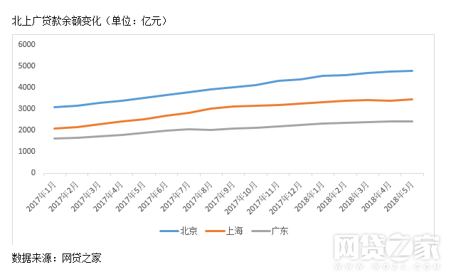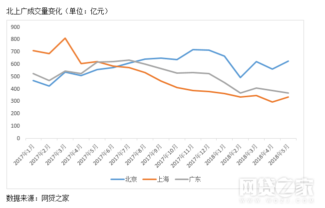 从成交量来看,自去年8月底到今年5月底,北京网贷行业月成交量基本维持在去年8月的水平,而上海和广东则呈逐月下降状态。