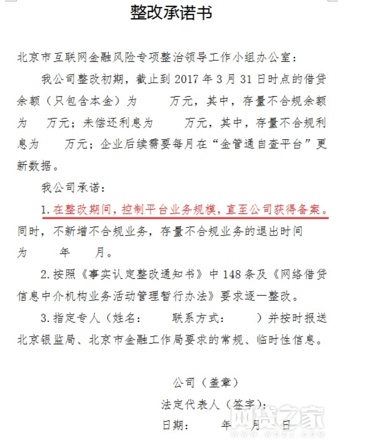另据网贷之家整理,早在2017年8月,就有网传的一份据称是北京平台需向北京互金专项整治工作领导小组办公室提交的“整改承诺书”的文件,显示在整改期间,控制平台业务规模,直至公司获得备案。同时,不新增不合规业务。