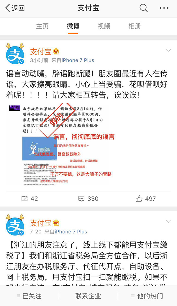 7月23日,有朋友圈传言称“蚂蚁金服8月1日起,借呗将全部停止,花呗使用限额单笔1000内,最高开放额度2000,超过部分将于8月1日内全部执行收回。”当日11时44分,支付宝官方微博对上述传言进行了回应。