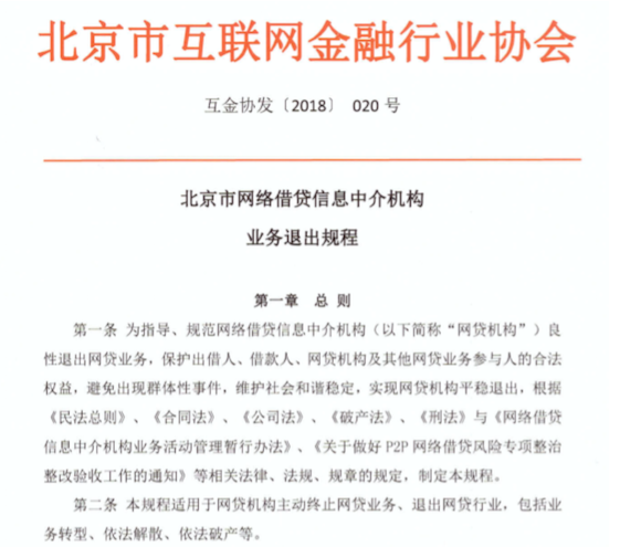 7月23日,为指导、规范网贷机构主动退出网贷业务,保护出借人、借款人、网贷机构及其他网贷业务参与人的合法权益,避免出现群体性事件,维护社会和谐稳定,实现网贷机构平稳退出,北京市互联网金融行业协会正式下发《北京市网络借贷信息中介机构业务退出规程》(互金协会发[2018]020号))(下称《退出规程》)。