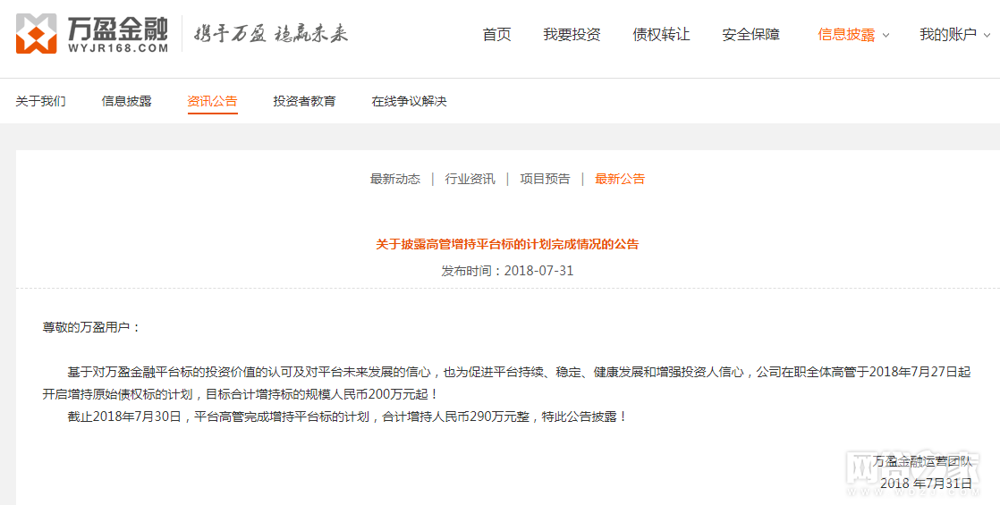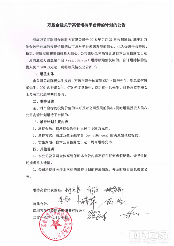 7月31日,万盈金融官网发布“关于披露高管增持平台标的计划完成情况的公告”,称截止2018年7月30日,平台高管完成增持平台标的计划,合计增持人民币290万元整。
