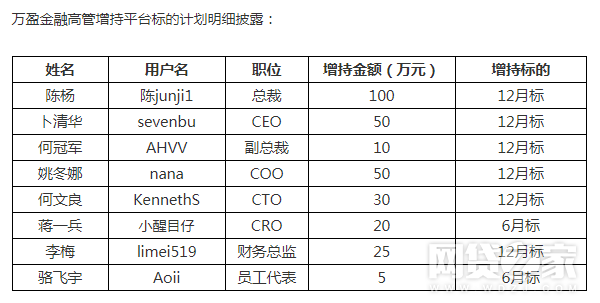此前的7月27日,万盈金融曾发布“关于高管增持平台标的计划的公告”,称基于对万盈金融平台标的投资价值的认可及对平台未来发展的信心,也为促进平台持续、稳定、健康发展和增强投资人信心,公司在职全体高管计划自本公告披露之日起一周内通过万盈金融平台(wyjr168.com)增持原始债权标的,合计增持标的规模人民币200万元起。