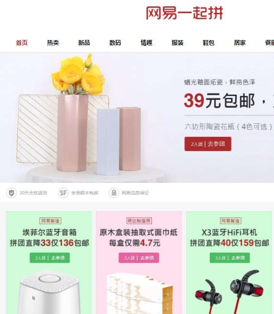 比支付宝、京东更早,网易在2017年就推出了“网易一起拼”、“严选一起拼”平台。目前,网易的拼购平台包含数码、服装、鞋包、居家等商品品类。