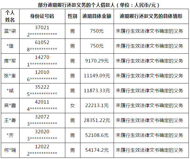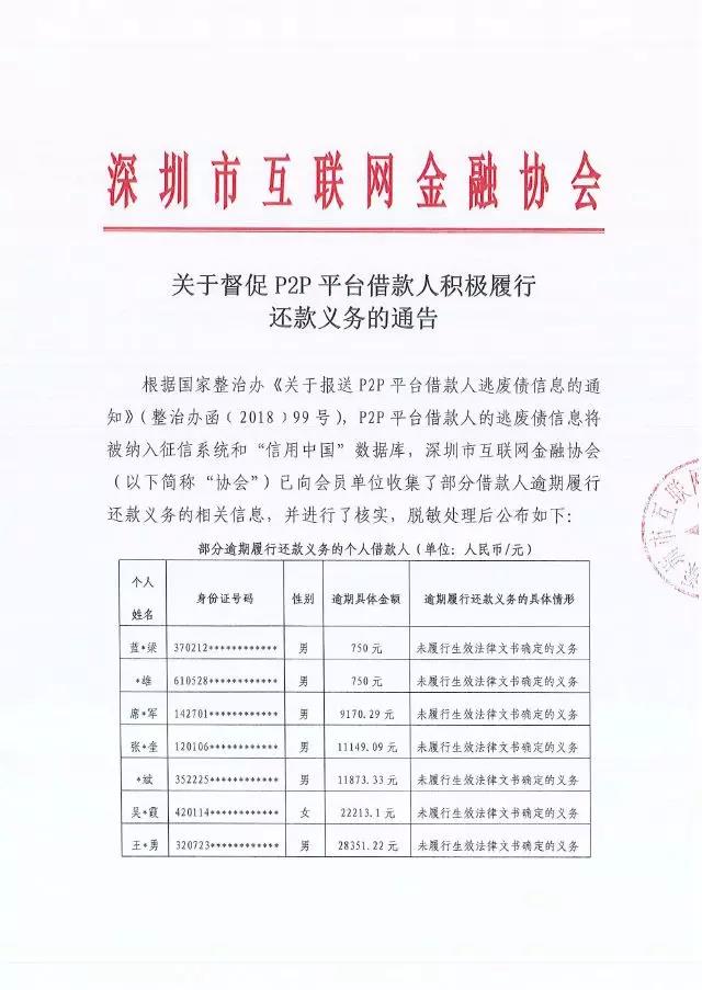 根据国家整治办《关于报送P2P平台借款人逃废债信息的通知》(整治办函﹝2018﹞99号),P2P平台借款人的逃废债信息将被纳入征信系统和“信用中国”数据库,深圳市互联网金融协会(以下简称“协会”)已向会员单位收集了部分借款人逾期履行还款义务的相关信息,并进行了核实,脱敏处理后公布如下: