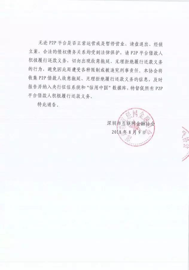 无论P2P平台是否正常运营或是暂停营业、清盘退出、经侦立案,合法的债权债务关系均受到法律保护,请P2P平台借款人积极履行还款义务,切勿出现故意拖延、无理拒绝履行还款义务的行为,避免因此而遭受各种限制或被追究刑事责任。本协会将收集P2P借款人故意拖延、无理拒绝履行还款义务的信息,及时报告并纳入央行征信系统和“信用中国”数据库,特督促所有P2P平台借款人积极履行还款义务。