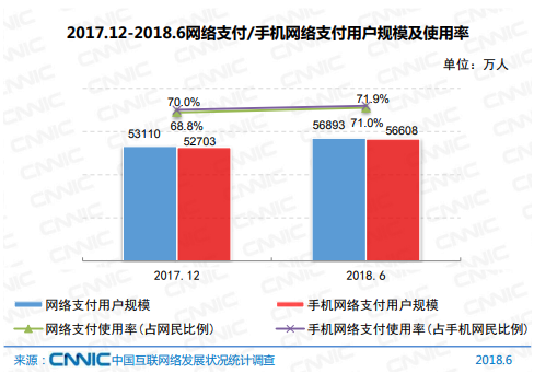 报告显示,截至2018年6月,我国网络支付用户规模达到5.69亿,较2017年末增加3783万人,半年增长率为7.1%,使用比例由68.8%提升至71.0%。网络支付已成为我国网民使用比例较高的应用之一。其中,手机支付用户规模增长迅速,达到5.66亿,半年增长率为7.4%,在手机网民中的使用比例由70.0%提升至71.9%。