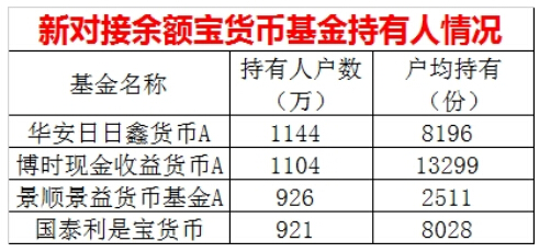 新对接的货币基金持有人户数也在1000万户左右,其中,华安和博时两家公司的产品户数超过1100万。