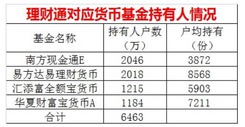 其中,南方现金通E和易方达易理财货币的持有人户数超过2000万大关,分别为2046万户和2018万户,户均持有金额则是易方达的最大,达到了8568份,也就对应8568元。