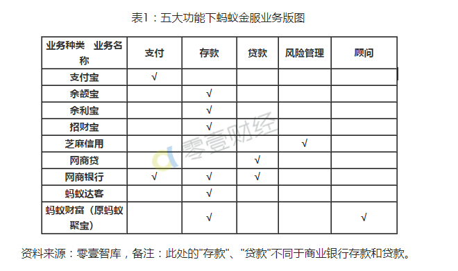 笔者试着按这五大功能,对蚂蚁金服的业务版图进行分析归类,结果如表1所示。