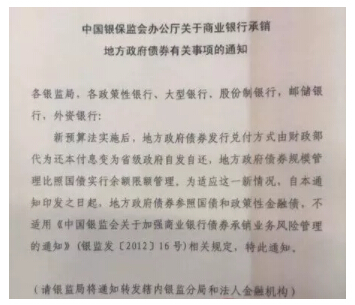 通知指出,新预算法实施后,地方政府债券发行兑付方式由财政部代为还本付息变为省级政府自发自还,地方政府债券规模管理比照国债实行余额限额管理。为适应这一新情况,自通知印发之日起,地方政府债券参照国债和政策性金融债,不适用《中国银监会关于加强商业银行债券承销业务风险管理的通知》(银监发[2012]16号)(以下简称“银监发[2012]16号文”)相关规定。