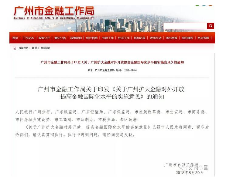 6月21日上午,在2018年“广州金融”发布会上,广州市金融工作局局长邱亿通透露,广州市已经拟定扩大金融对外开放提高金融国际化水平的10条政策措施。不到3个月,10条政策措施正式落地。