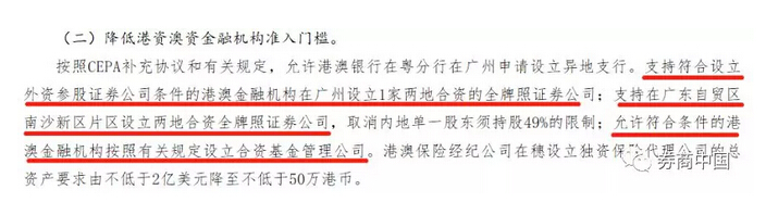 同时,支持符合设立外资参股证券公司条件的港澳金融机构在广州设立1家两地合资的全牌照证券公司;支持在广东自贸区南沙新区片区设立两地合资全牌照证券公司。允许符合条件的港澳金融机构按照有关规定设立合资基金管理公司。