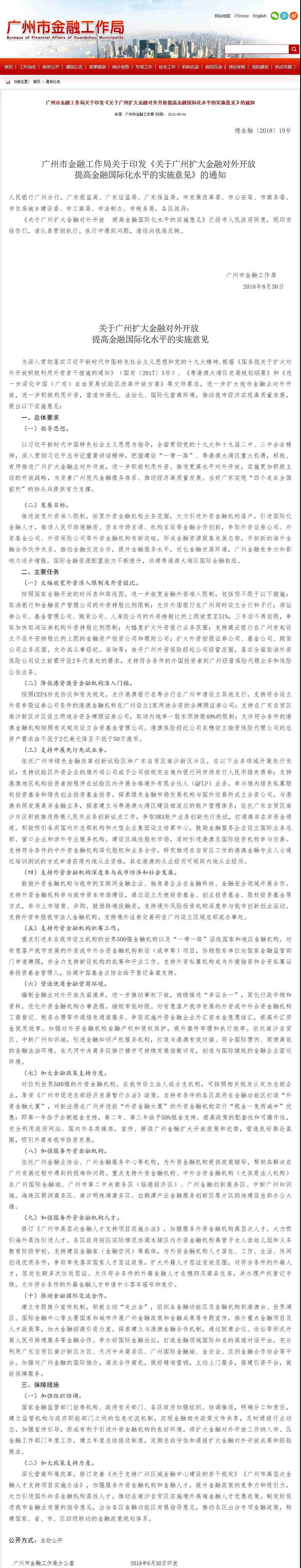 券商中国记者从广州市金融工作局官网获悉,印发《关于广州扩大金融对外开放提高金融国际化水平的实施意见》(简称《实施意见》)的通知。