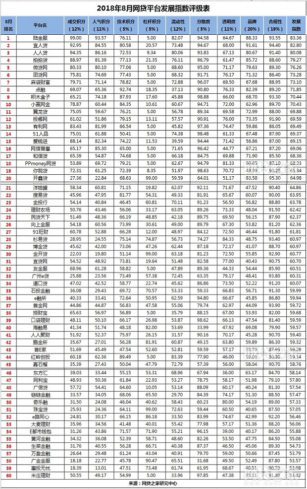 首先我们来看一下2018年8月网贷平台发展指数评级TOP60排行榜(来源网贷之家)。