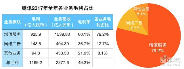 如果我们从毛利来看,虽然网络游戏与社交网络的毛利润没有分开介绍,但这两项之和占了腾讯2017年总毛利的79.2%,接近8成的份额。