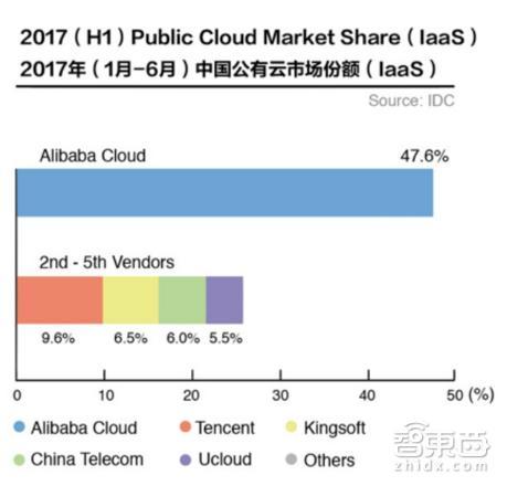 中国第一大云“阿里云”在2009年推出,在9年时间里做到了全国第一,根据IDC 2017年上半年中国公共云IaaS市场份额调研结果显示,阿里云以5亿美元营收,47.6%市场份额的绝对优势坐稳了中国云市场老大位置。
