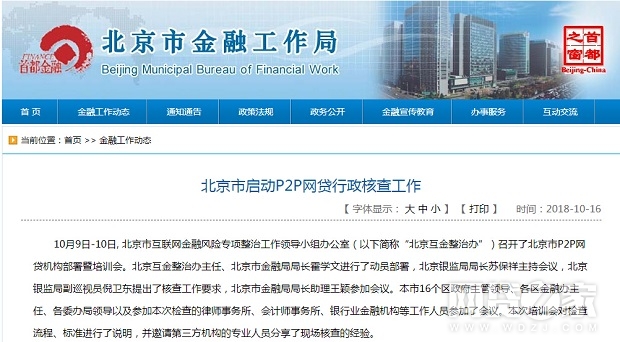 10月16日,北京市金融工作局官网发布“北京市启动P2P网贷行政核查工作”的文章,称北京P2P平台行政核查拟于10月中旬开始,下一步将全面展开北京市P2P网贷机构行政核查工作。