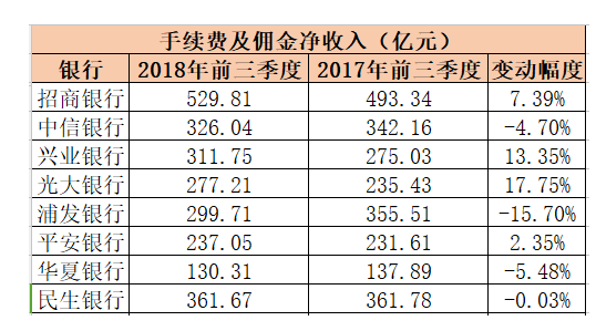 上市的8家股份制银行中,4家银行的手续费及佣金净收入规模下降,分别为中信银行、浦发银行、华夏银行和民生银行。其中,浦发银行该项收入下滑较为明显,从去年前三季度的355.51亿元,降至今年同期的299.71亿元,同比降幅达15.70%。中信银行和华夏银行分别降低4.70%、5.48%。民生银行仅小幅下滑,与去年同期基本持平。