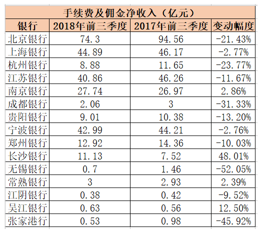 在15家上市城商行中,11家的手续费及佣金净收入规模呈下降状态,仅有南京银行、长沙银行、吴江银行及常熟银行4家同比出现增长。其中,无锡银行大降52.05%,张家港行、该项收入降幅超40%,成都银行下降31.33%,北京银行、杭州银行降幅均超20%。