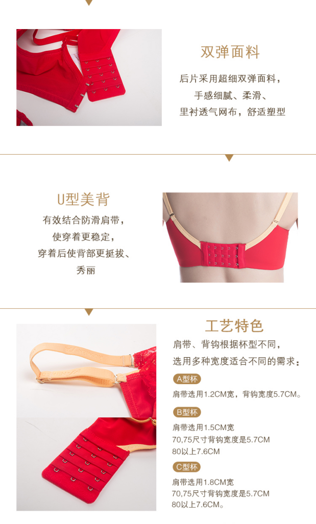 重要提示:聚拢,无插片,3种杯型;一组2套(包含两套内衣内裤),大红色/红金色 尺码:65A-95F