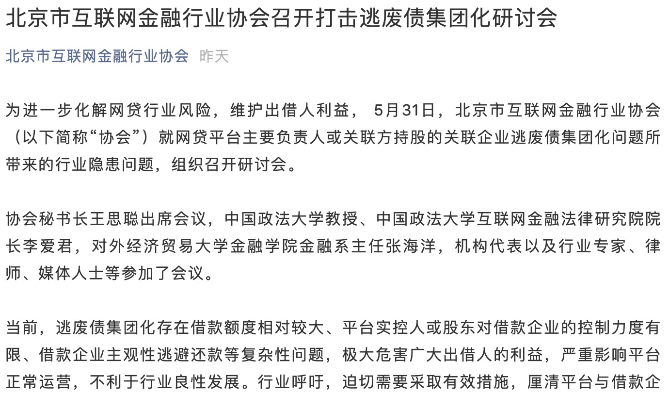 5月31日,北京市互联网金融行业协会(下称“北京互金协会”)官方微信公众号发布消息称,为进一步化解行业风险,维护出借人利益,北京互金协会就主要负责人或关联方持股的关联企业逃废债集团化问题所带来的行业隐患问题,组织召开研讨会。