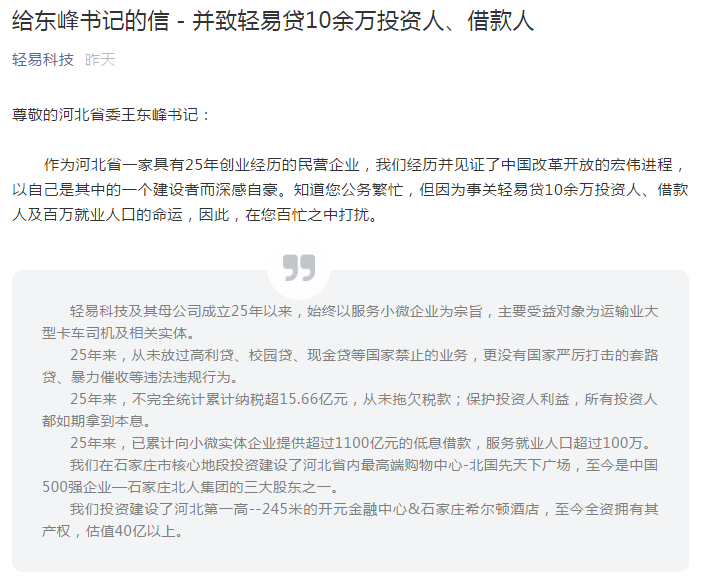 作为河北省一家具有25年创业经历的民营企业,我们经历并见证了中国改革开放的宏伟进程,以自己是其中的一个建设者而深感自豪。知道您公务繁忙,但因为事关轻易贷10余万投资人、借款人及百万就业人口的命运,因此,在您百忙之中打扰。