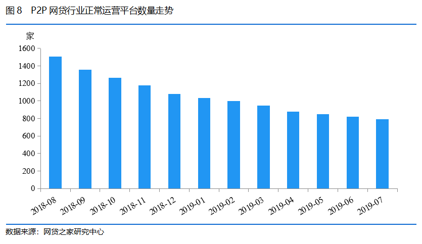 平台数量方面,月报显示,截至2019年7月底,P2P网贷行业正常运营平台数量继续呈现下行的态势,跌破800家整数关口,下降至787家,相比6月底减少了30家。据不完全统计,7月停业及问题平台数量为30家,仍然以平台清盘分期兑付和网站关闭为主。