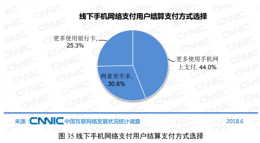 数据显示,网民在线下消费时使用手机网络支付的比例由2017年12月的65.5%提升至68.0%,其中城镇网民使用比例为71.9%,农村为57.0%。在线下消费使用手机网络支付的用户中,有44.0%首选手机网络支付,相比2017年12月提高5个百分点,其中城镇网民这一比例为46.8%,农村网民为36.5%。