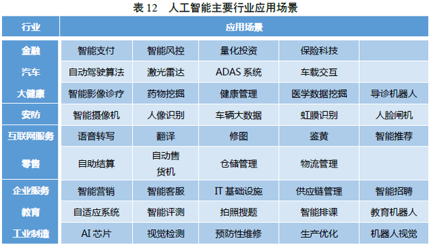 产业应用方面,人工智能技术的快速发展,对传统行业具有重塑性功能,并且通过改良创新,为行业提供新的辅助性工具,促进行业进步,在金融、交通、健康、安全等诸多领域,起到积极作用。首先,机器人市场发展迅速,机器人是公众认知较强的人工智能产物,在线下零售店、家庭儿童教育、养老陪护及家务工作等多种场景落地迅速,机器人产品市场快速成长,如教育机器人、扫地机器人市场;其次,医疗健康领域,人工智能帮助改善医疗资源分布不均的问题,助力医学专家攻坚克难,在语音录入病历、医疗影像分析、诊疗、健康管理、药物研发等方面,都有显著成效;最后,金融领域人工智能应用场景广泛,从身份认证、智能风控到资产管理、投资分析研判,人工智能技术革新,与金融领域相辅相成,进一步提高行业安全性。